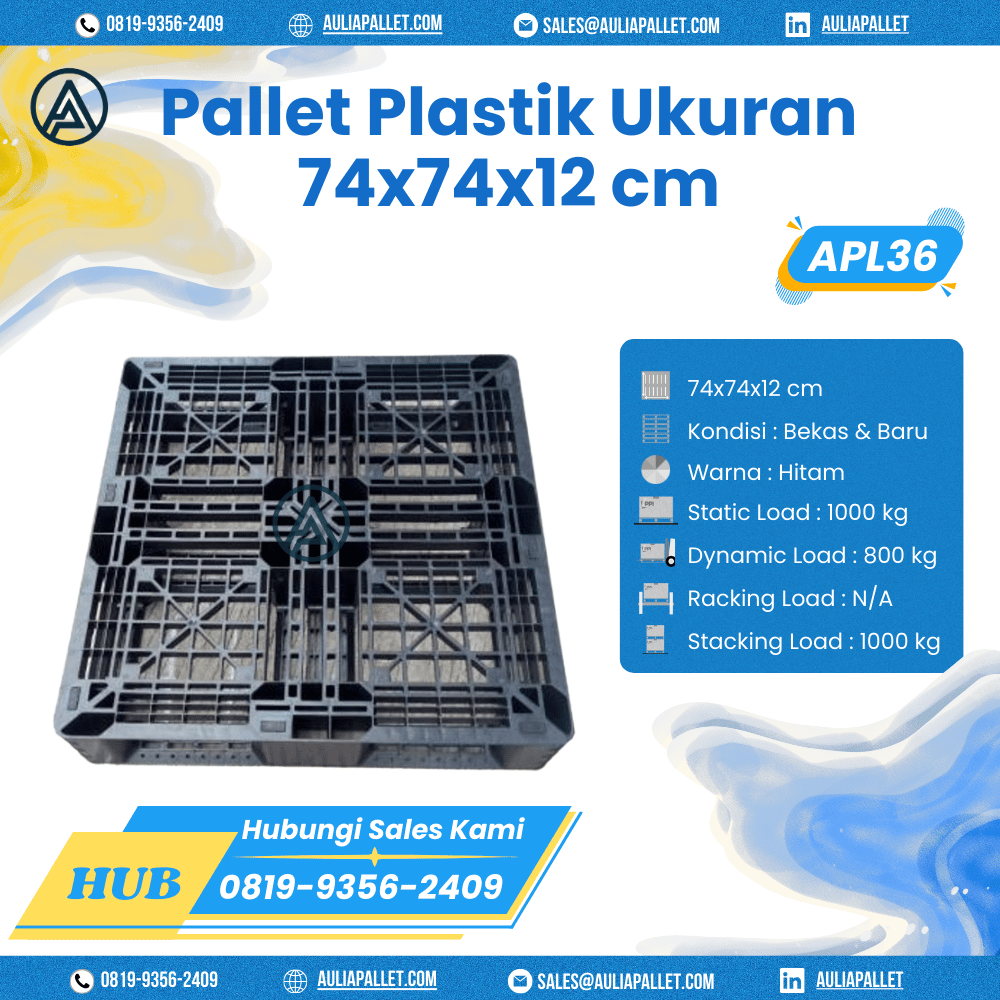 Dapatkan Pallet Plastik Bekas/Baru Ukuran 74x74x12 cm – APL36 dengan harga terbaik hanya di Aulia Pallet. Untuk informasi lebih lanjut, pemesanan, maupun konsultasi kebutuhan pallet Anda, segera hubungi:
